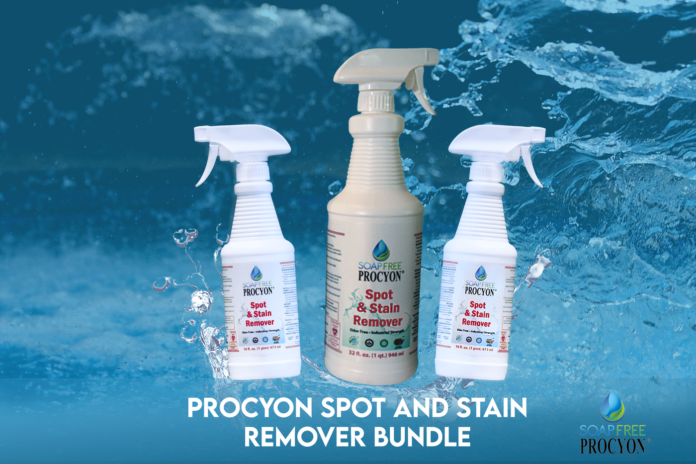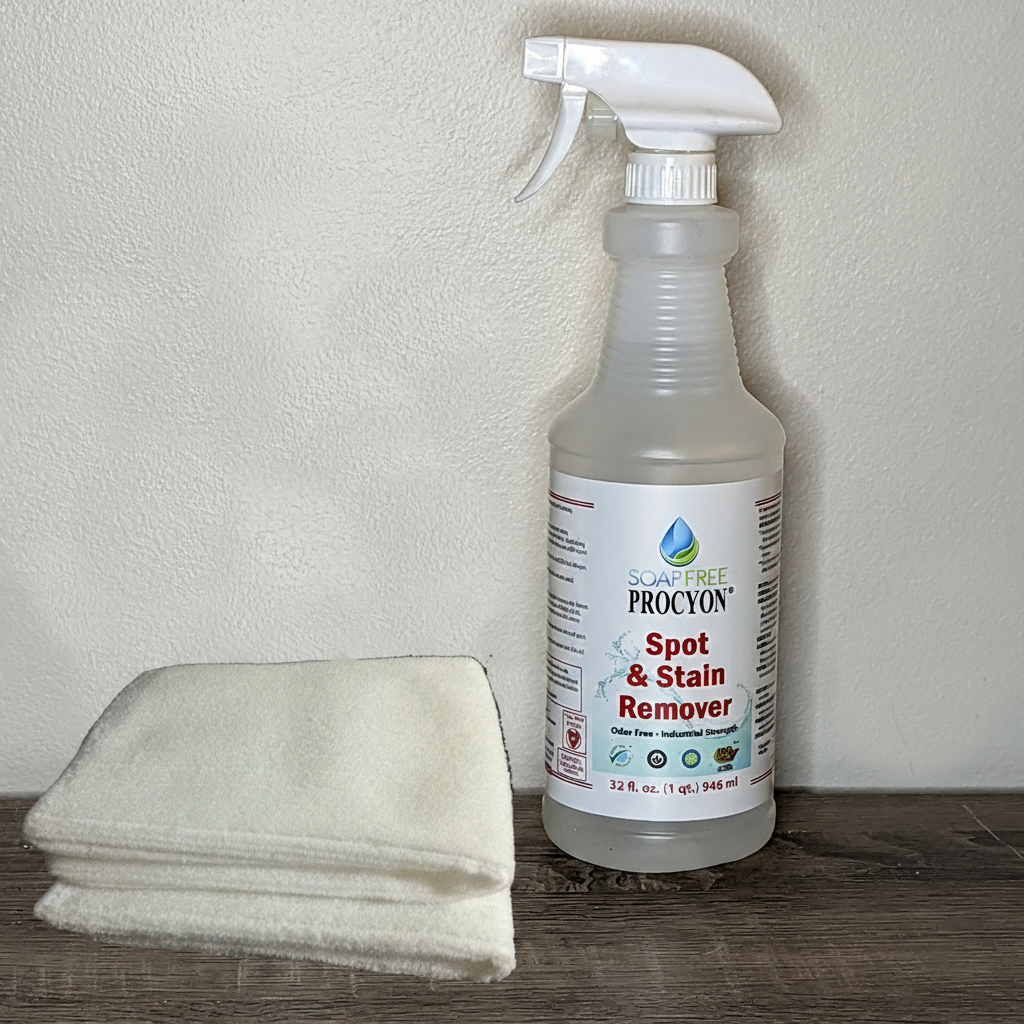 Our New Spot & Stain Remover Kit comes with a 32 ounce bottle of the legendary Procyon Spot & Stain Remover + a white microfiber cloth now with free shipping!